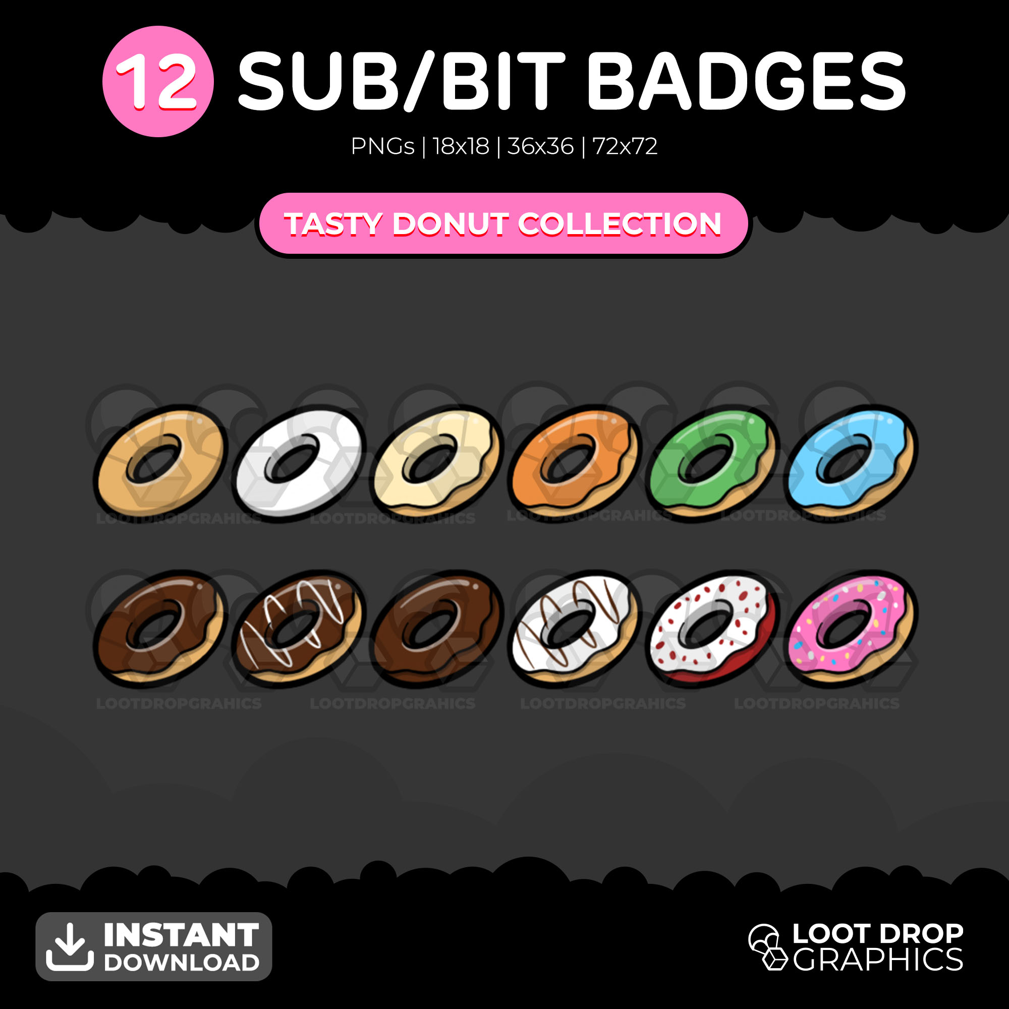 A selection of donut badges that you can use on Twitch, YouTube, Facebook or Discord. You will receive a collection of 12 different donut flavours. You are free to pick which design is best for which length of loyalty.