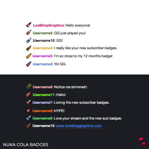These Nuka Cola subscriber badges are inspired by Fallout the game. This package includes a base design and sub badges for 3 months, 6 months and 1 year.