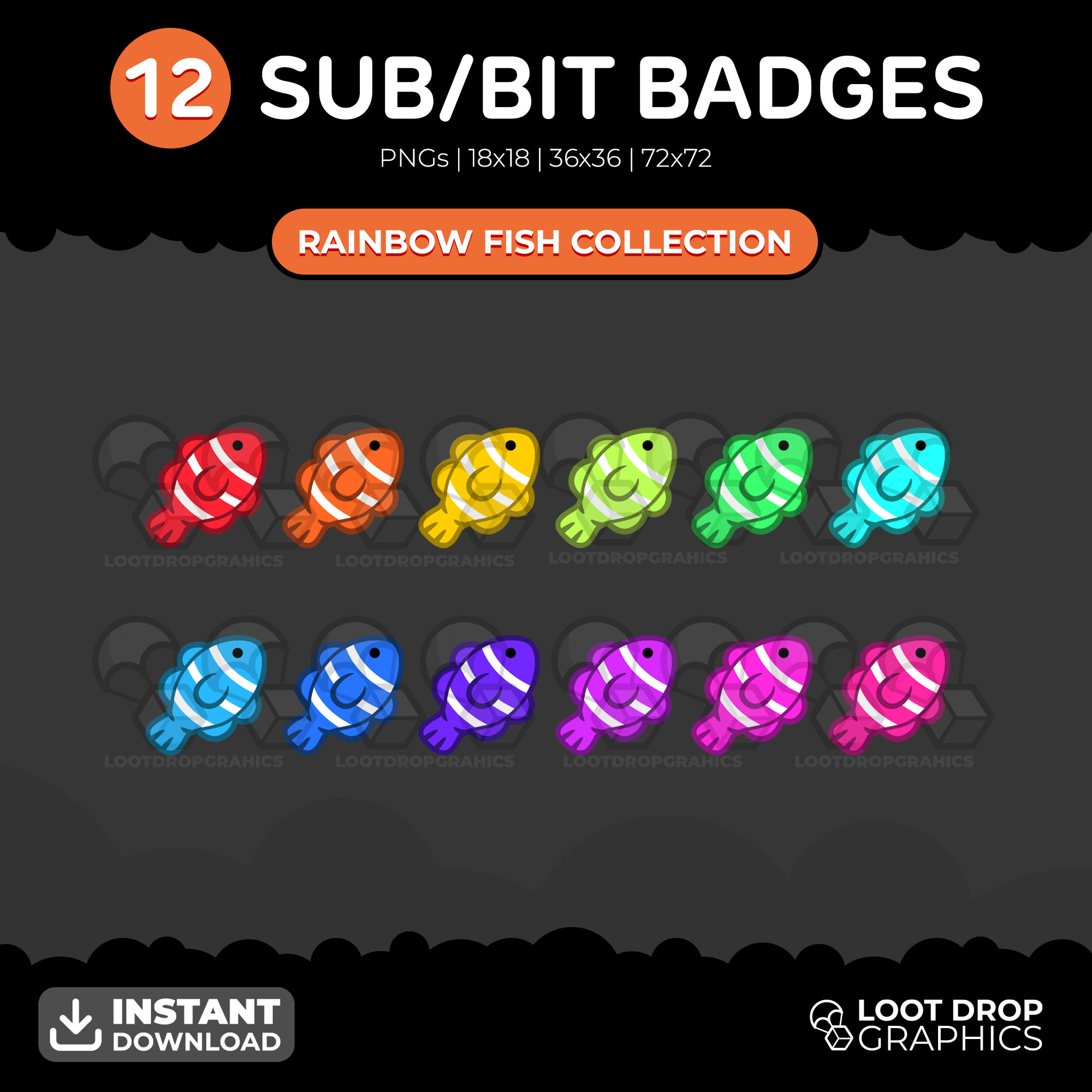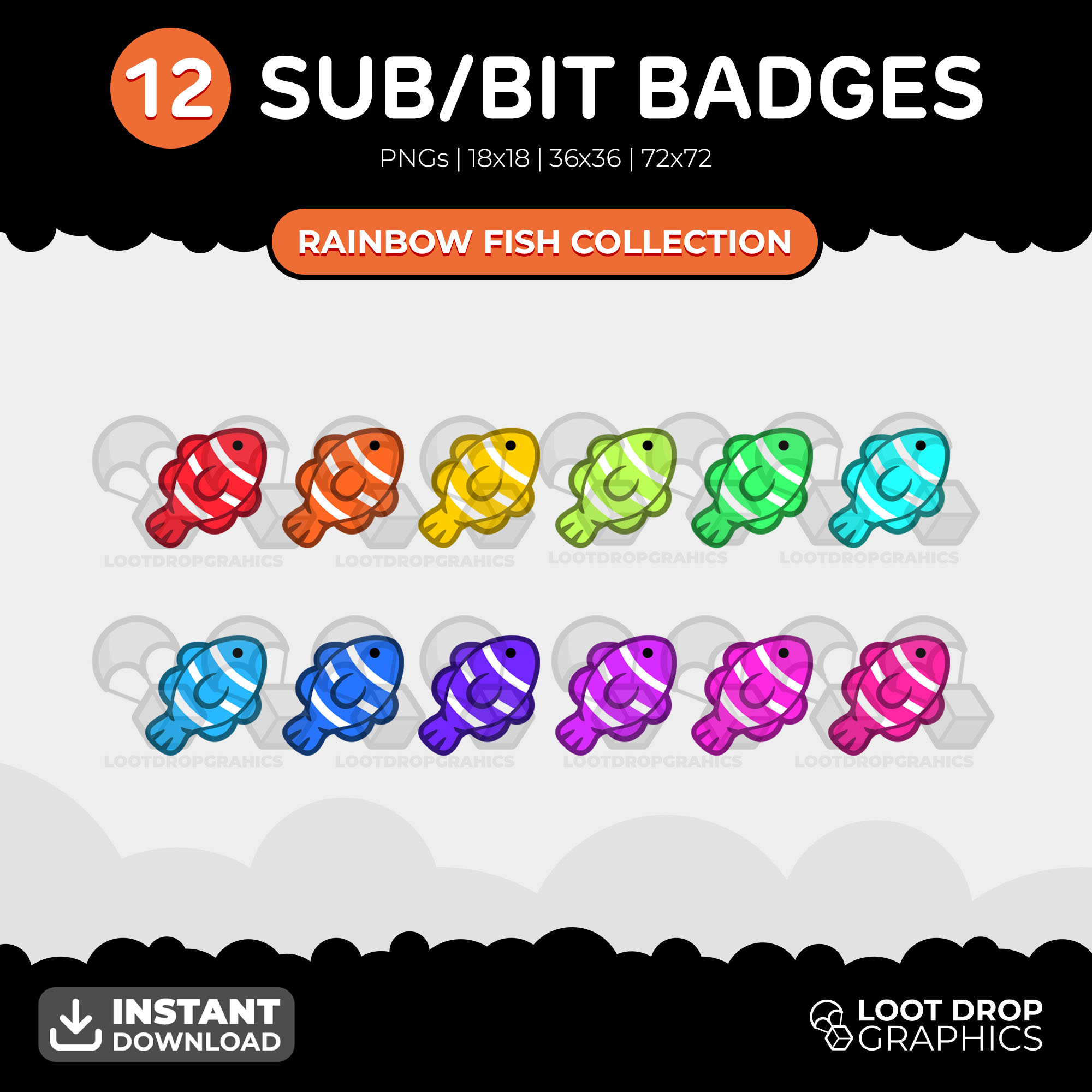 These rainbow fishies sub/bit badges are great for showing the different levels of subscription tiers on your Twitch channel.
