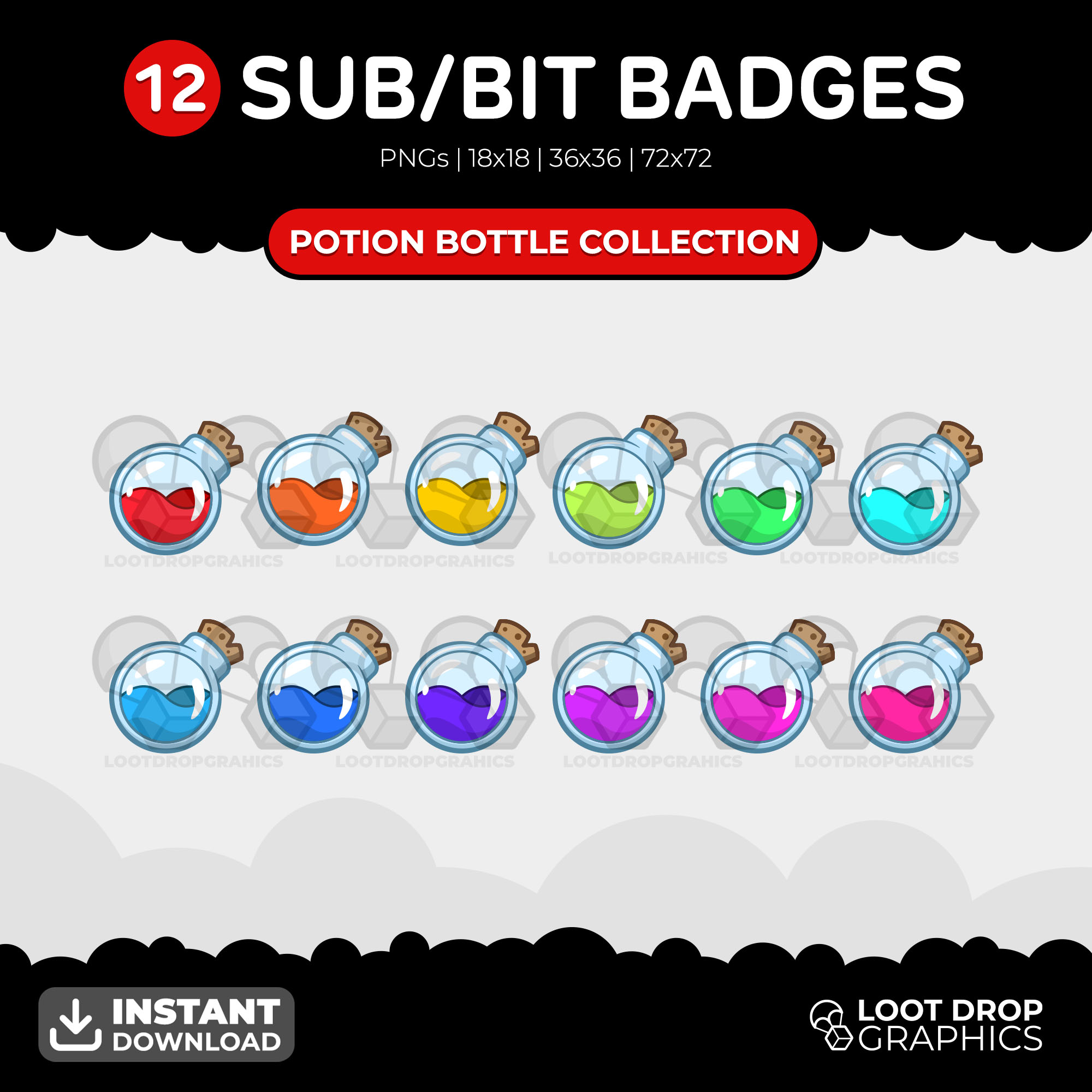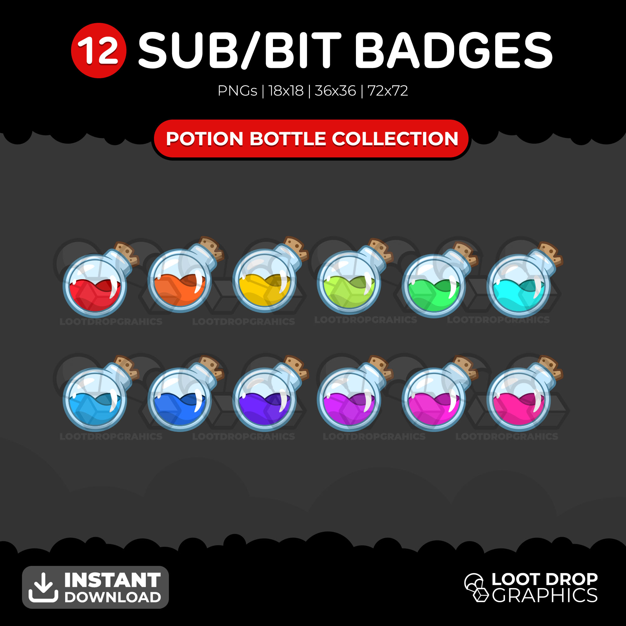 These potion bottle sub/bit badges are great for showing the different levels of subscription tiers on your Twitch channel. They can also be used as subscriber badges if you prefer.